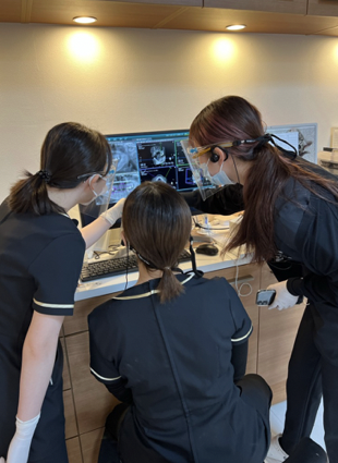2022.06.30 ブログ インプラント勉強会 インプラント体相談中の衛生士の様子です。 インプラントは埋入する際に骨の長さ、インプラント体の長さをしっかり決めてから治療が始まります 最近ではこのように衛生士同士でインプラントをされる患者様のご予約の1週間前にレントゲン写真やCT写真を見てインプラント体を決めてカンファレンスを行なっています👩⚕️ 1週間前計画を立てる事で当日施術をする院長や助手につく衛生士が余裕を持って取り組めます✊ 真剣に相談してます!!笑 にしの歯科クリニック
